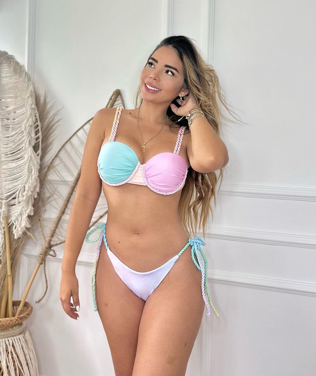 Traje de baño dos piezas varilla más panty amarrar a los lados trenzado artesanal degrade tonos pastel rosa verde amarillo