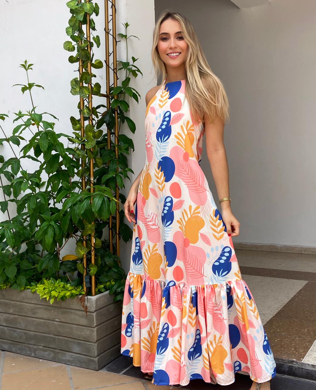 Vestido Largo. Estampado Fondo Blanco y Colores azul, naranja y rosa.