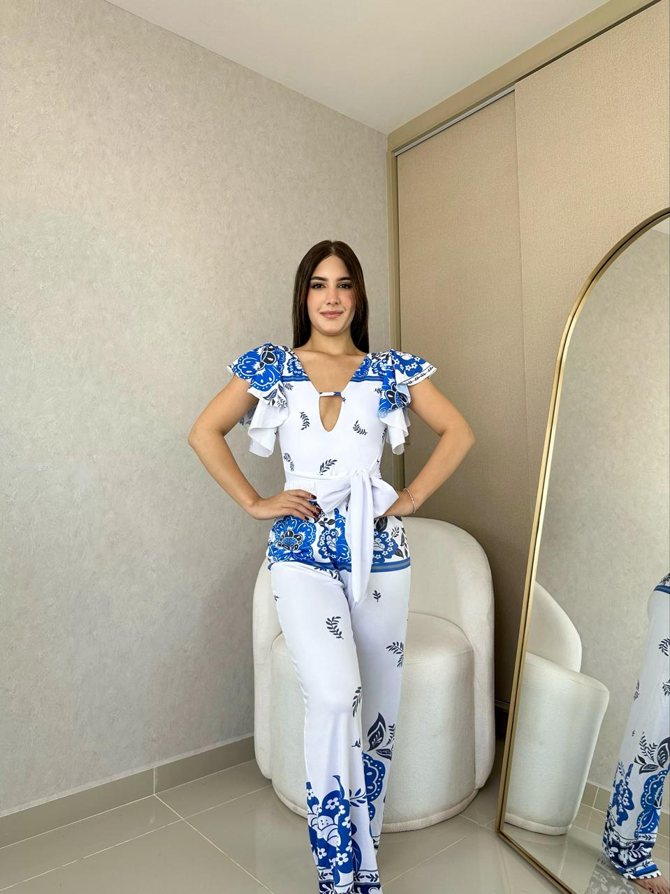 Combo traje de baño enterizo con Pantalón playero. Estampado Blanco y Azul